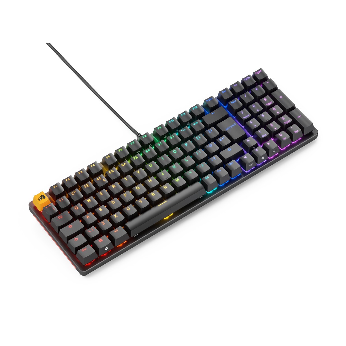 Designed with a premium black aluminum top plate, it offers both durability and a sleek aesthetic. The per-key customizable RGB lighting, powered by Glorious Core software, lets you create your own unique setup.